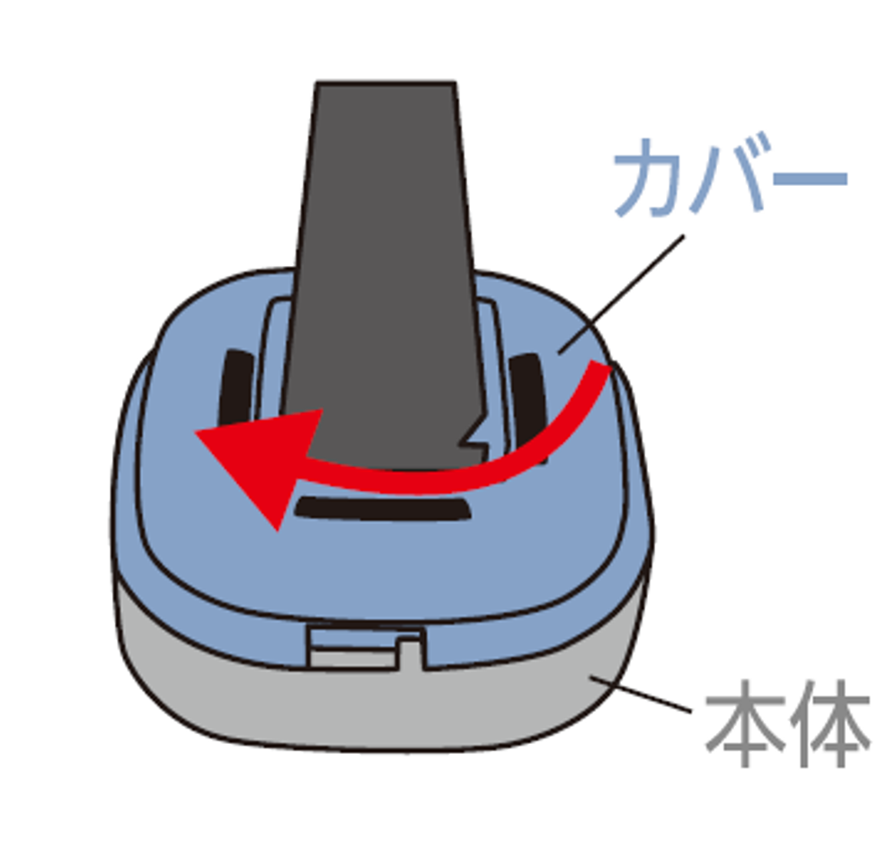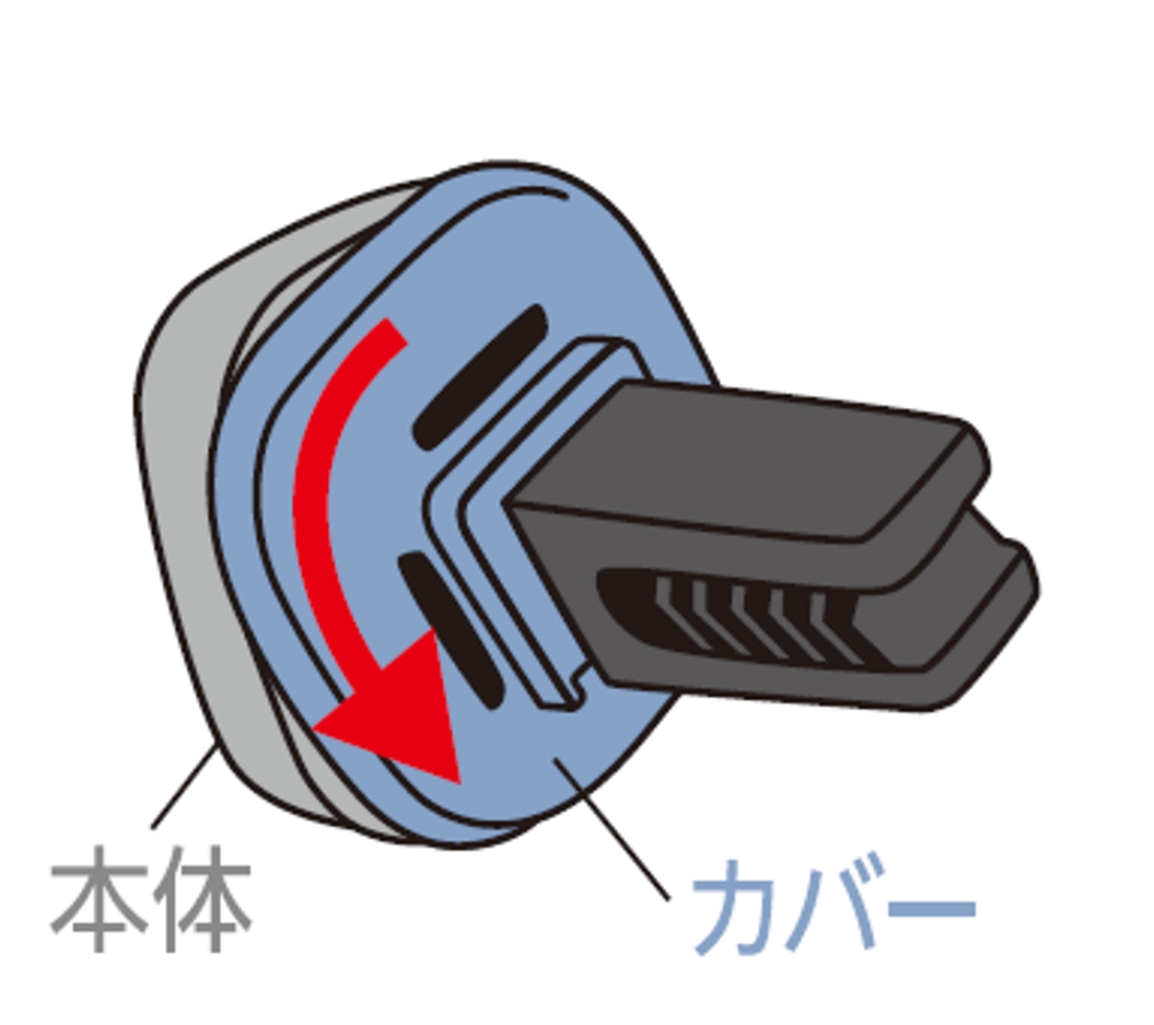 ③本体突起部とカバーへこみ部分を合わせ、矢印方向に回転して閉める。