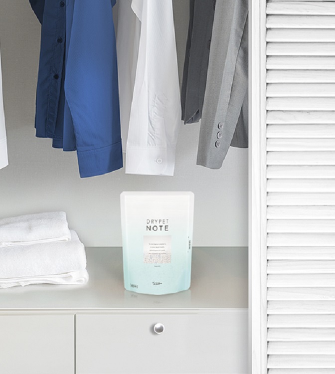 ●袋からスタンドパック容器を取り出し、そのまま湿気が気になる場所に立てて使用する。(白い面から吸湿する。)