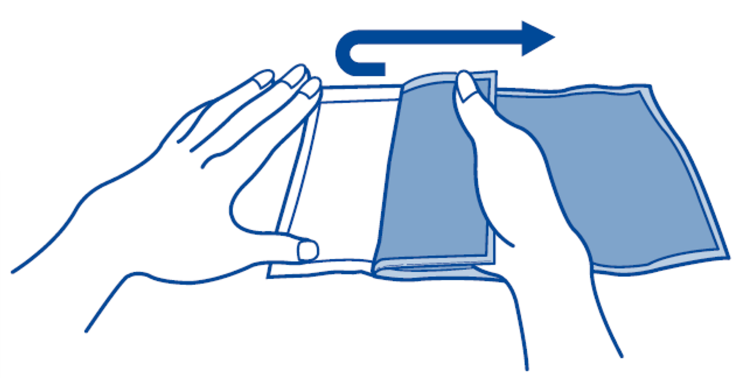 ①必ずテーブルの上などの平らな場所に置き、薬剤袋の端を図のように押さえ、アルミフィルムをゆっくりはがす。
