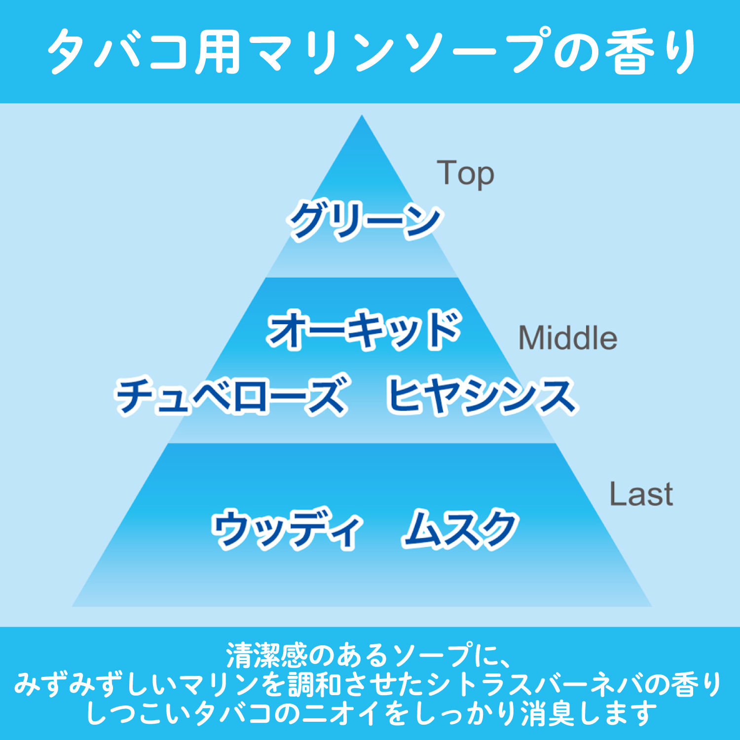 清潔感のあるソープに、みずみずしいマリンを調和させた爽やかなマリンソープの香り。しつこいタバコのニオイをしっかり消臭します。