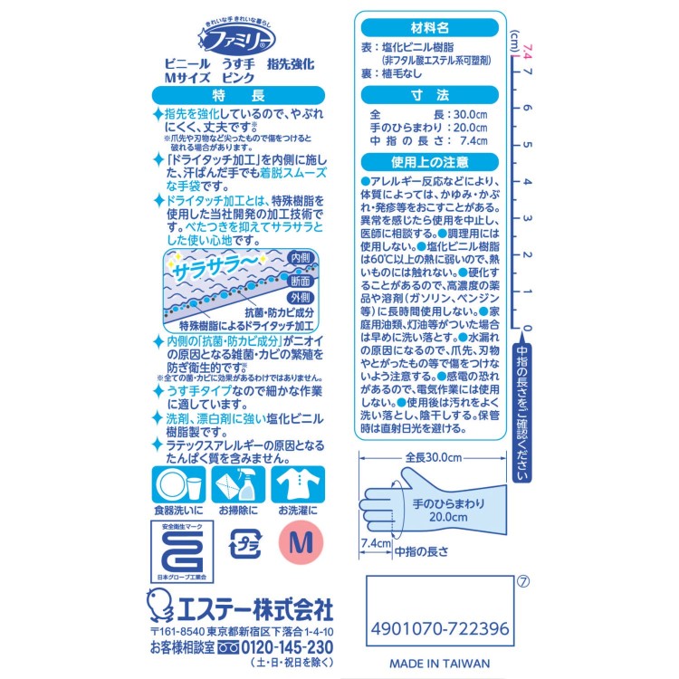 【ファミリー ビニール うす手 指先強化 M 3双パック】3双 - 寸法