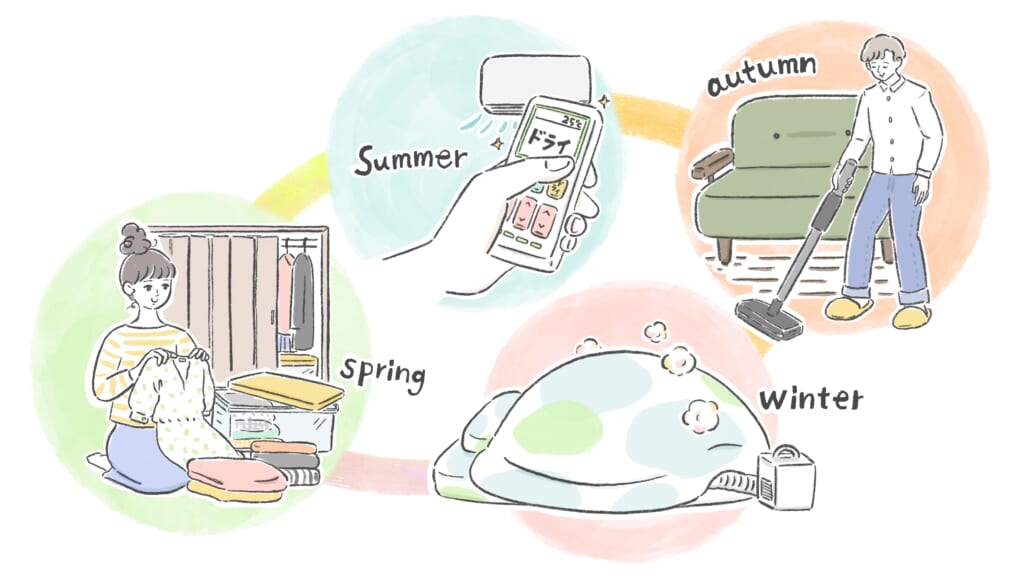 気温25℃以上、湿度65%以上が続く夏は、ダニにとってまさに「天国」。湿気をコントロールし、ダニの繁殖を抑えましょう。エアコンの冷房機能だけではなく「除湿機能」も活用しましょう。また、天日干しや布団乾燥機をこまめに使用して、寝具の湿気をしっかり取り除くのも有効です。湿気がこもりやすいクローゼットや引き出しには、除湿剤などの湿気対策グッズを置くのもおすすめです。