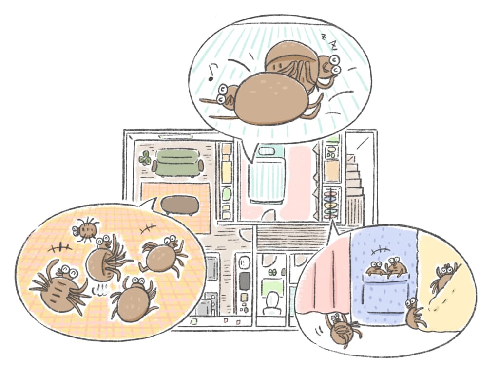 ・ヒョウヒダニ:家の中で最も多く見られるダニで、死骸やフンは快適な暮らしのために取り除いておきたいハウスダストの一種です。人のフケや皮膚の破片、食べこぼしなど、さまざまなものを餌として繁殖します。